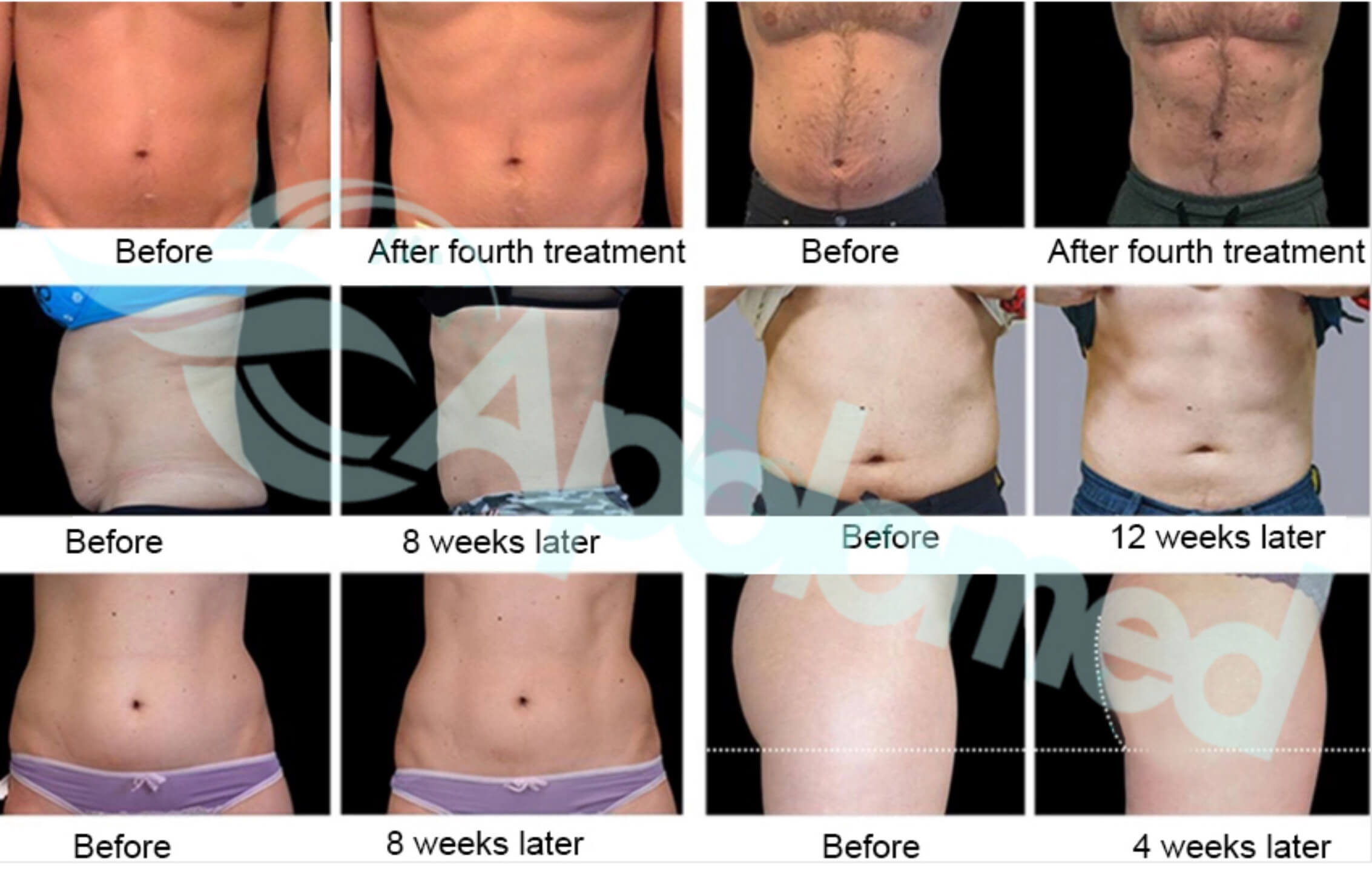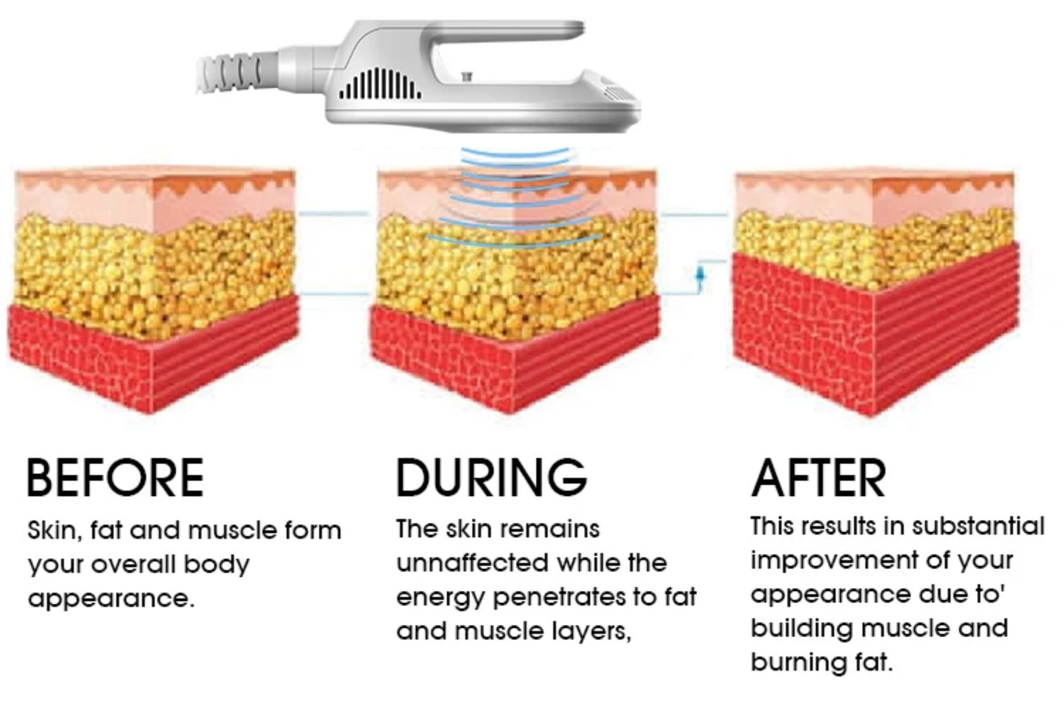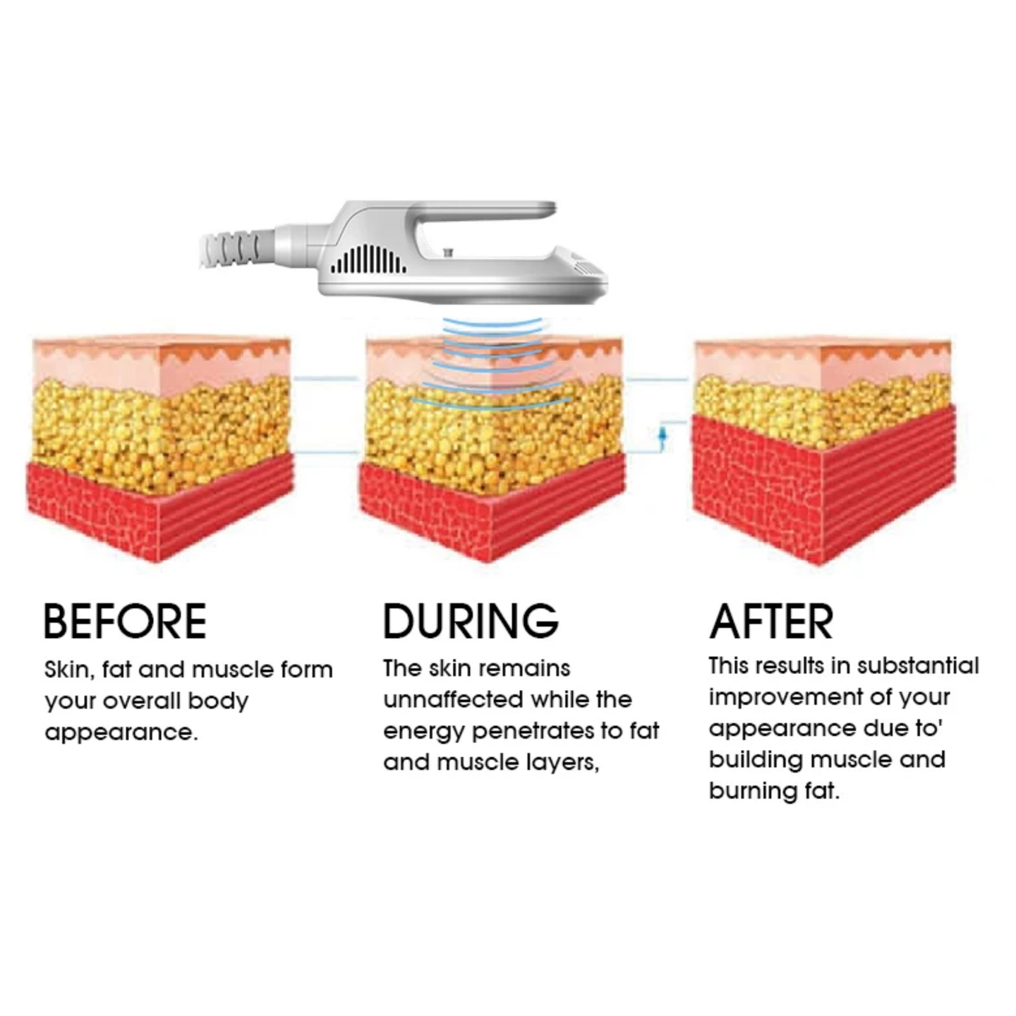 Dzięki procedurze terapii elektromagnetycznej o wysokiej intensywności można powiększyć obecne mięśnie, a także wyhodować nowe włókna mięśniowe. Stosując 3 różne aplikatory, procedura leczenia może leczyć brzuch, pośladki (ale unosić), ramiona, łydki, łydki, uda i mięśnie miednicy przywrócić.